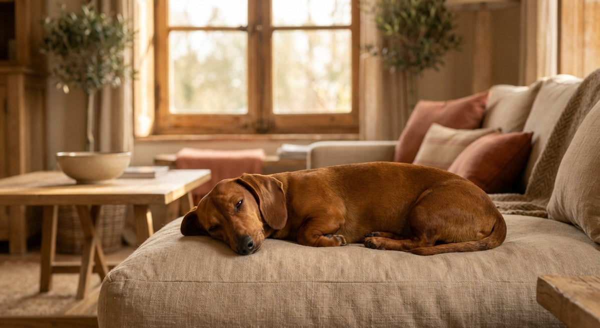 Dackelwelpen dürfen NICHT springen, weder auf das Sofa noch vom Bett oder aus dem Auto. Investiere frühzeitig in eine Hunderampe fürs Auto und Trittstufen für Möbel. Die Wirbelsäule des Dackels ist von Geburt an anfällig für Bandscheibenprobleme. Prävention beginnt am ersten Tag.