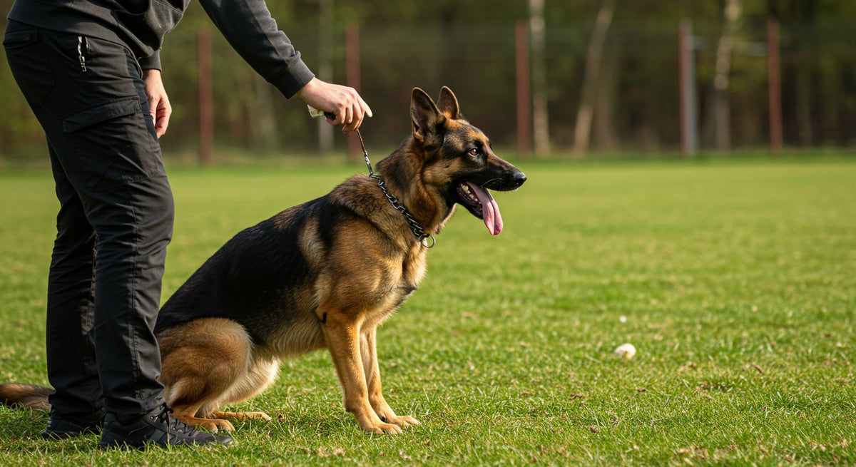 Ein verstellbares Y-Geschirr, das mit dem Welpen mitwächst. Kein Halsband für den Alltag — Schäferhunde ziehen an der Leine, und der Druck auf den Hals schadet den empfindlichen Halswirbeln. Die Passform alle 4–6 Wochen prüfen, Schäferhund-Welpen wachsen schnell.