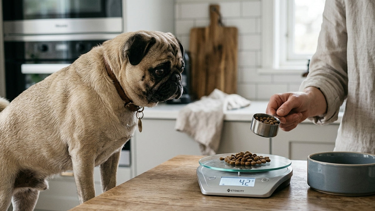 Die Futtermenge hängt von Gewicht, Alter und Aktivität ab. Möpse sind keine Marathonläufer — die meisten bewegen sich moderat und brauchen weniger Futter, als ihre bettelnden Augen vermuten lassen. Hier die Richtwerte für erwachsene Möpse mit normaler Aktivität: