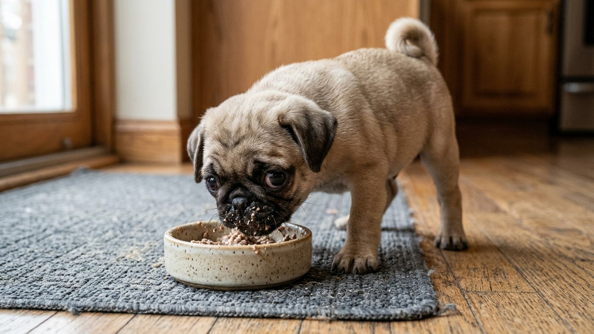 Mops-Welpen wachsen schnell und brauchen in den ersten zwölf Monaten eine andere Nährstoffzusammensetzung als erwachsene Hunde. Mehr Protein, mehr Fett, mehr Kalzium für den Knochenaufbau — aber kontrolliert, denn auch Welpen können bei Möpsen schon zu dick werden.