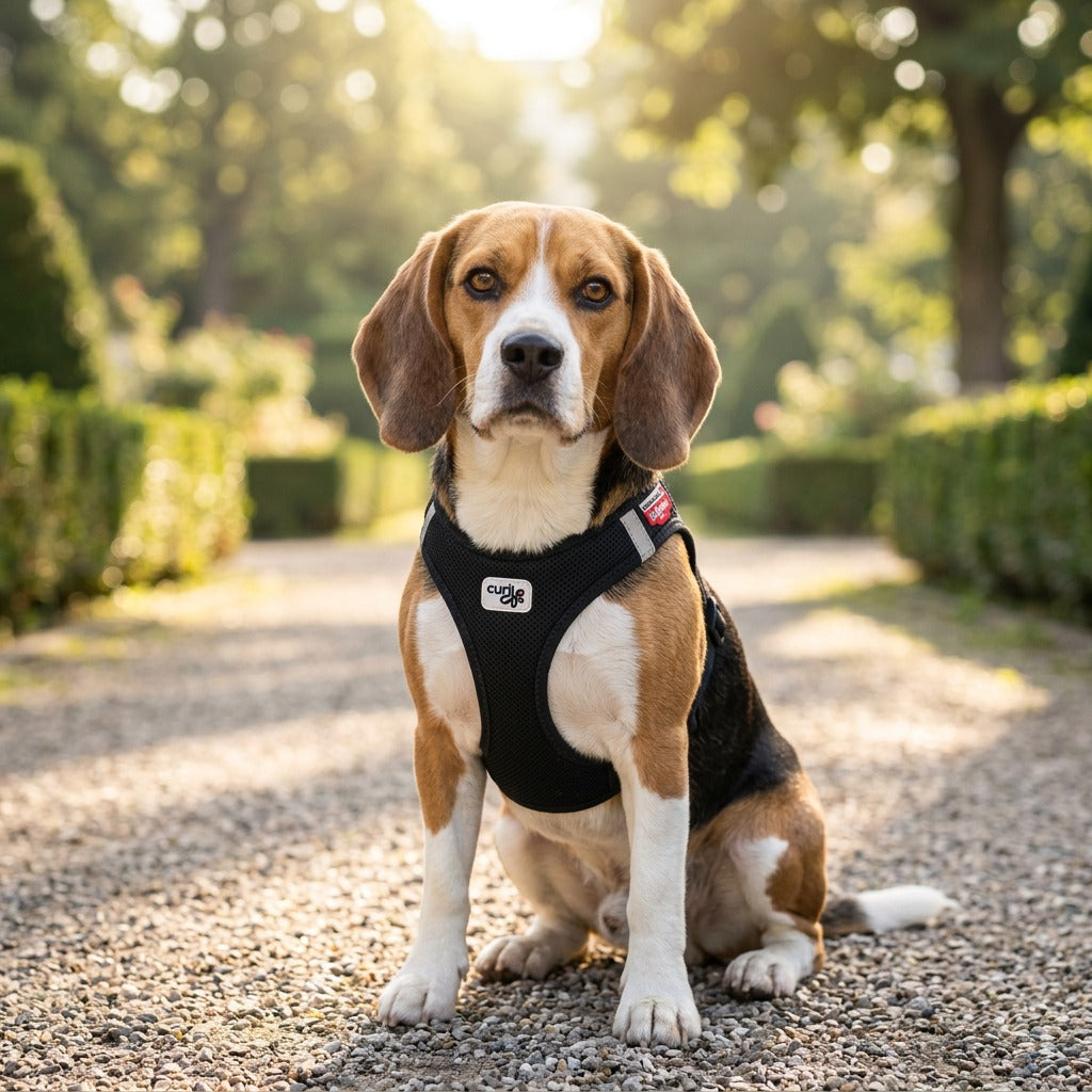 Sicherer Sitz bei kompakter Statur: Beagle sind tonnenförmig. Breiter Brustkorb, kurze Beine, tiefer Schwerpunkt. Geschirre, die für schlanke Rassen designt sind, rutschen beim Beagle seitlich. Verstellbare Bauch- und Brustgurte sind Pflicht, sonst sitzt nichts.