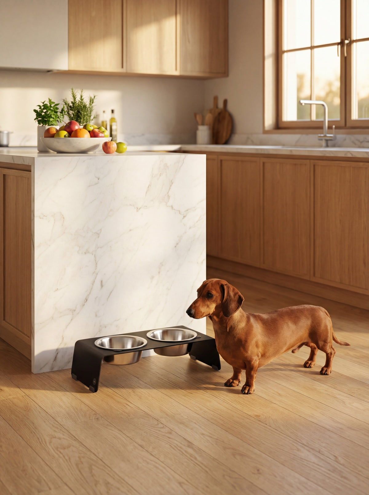Durch den langen Rücken belastet starkes Bücken die Bandscheiben – ein bekanntes Problem bei Dackeln (Dackellähme/IVDD). Ein moderat erhöhter Napf (10–15 cm) schont die Wirbelsäule bei jeder Mahlzeit.