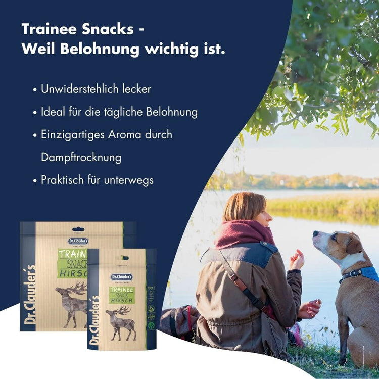 Dr.Clauder's Trainee Snacks Hirsch bestehen zu 95% aus köstlichem Hirschfleisch und sind ideal für Hunde und Katzen. Durch die schonende Dampftrocknung behält das Fleisch sein einzigartiges Aroma und bleibt besonders schmackhaft. Diese Snacks sind mit FOS (Fructooligosaccharide) angereichert, um die Verdauung Ihres Vierbeiners zu unterstützen.