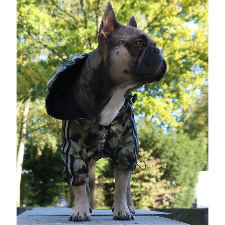 Unsere Camouflage Regenjacke ist besonders für französische Bulldoggen sowie für Hunde mit kurzem Fell, oder auch Welpen super geeignet. Bei jedem Regenwetter die beste Wahl.
