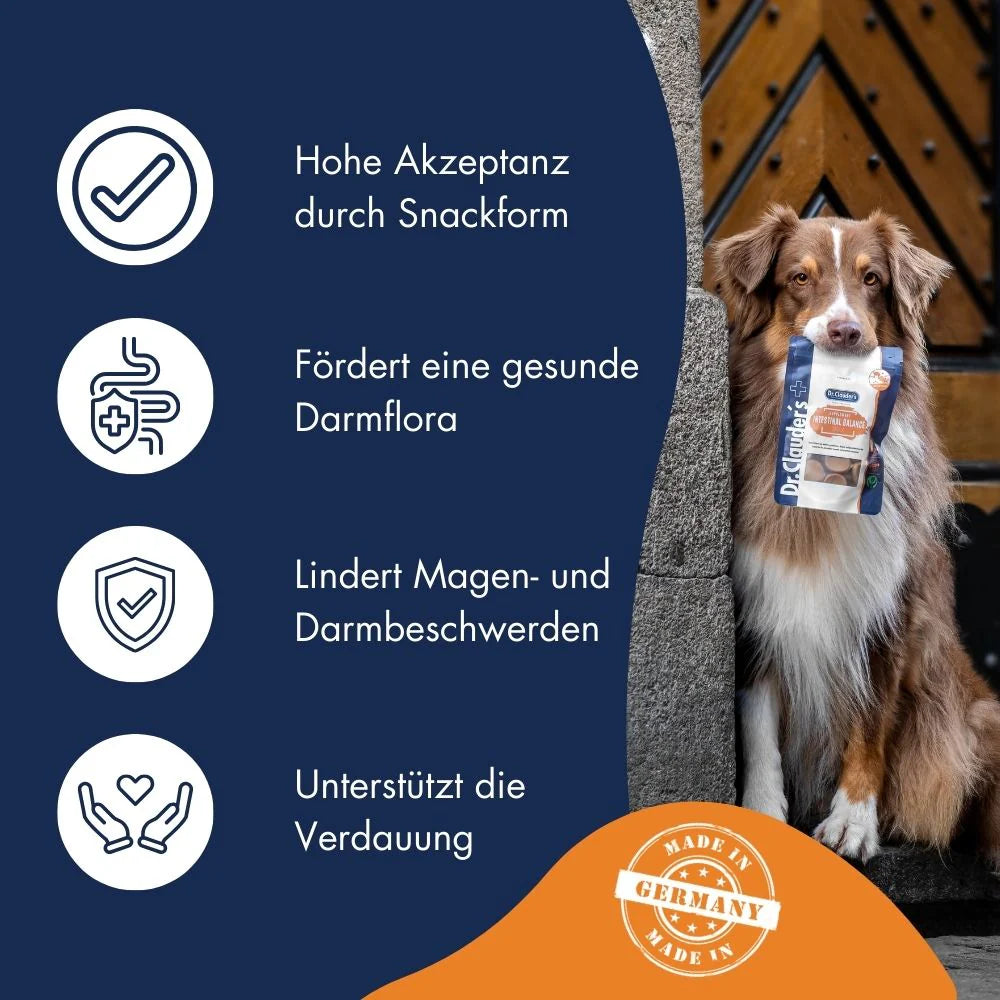 Wohlbefinden für Magen und Darm im Snackformat! Unser Snack für Hunde und Katzen kann mit seinen sorgfältig ausgewählten Inhaltsstoffen unterstützend bei ernährungsbedingten Magen- und Darmbeschwerden wirken und die Darmflora fördern. Die enthaltenen Flohsamen sind reich an Ballaststoffen und können die Verdauung regulieren, während Kamillenblüten für ihre beruhigende Wirkung auf den Magen-Darm-Trakt bekannt sind. Petersilie und Hanföl tragen zur Verdauung und zum allgemeinen Wohlbefinden bei, und Curcuma kann mit seinen antioxidativen Eigenschaften das Verdauungssystem positiv beeinflussen. Ein idealer Nahrungsergänzungssnack für die Verdauungsgesundheit.